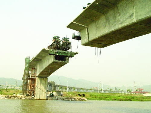 另一施工難點--簡支梁整跨拼裝,因軌道線路平面最小半徑只有300米,拼裝難控制,一公司專門在挪威訂做了安全性能和自動化程度高的600噸下行式預制節(jié)段拼裝架橋機,較好地解決了簡支梁半徑小,不易安裝的難題。