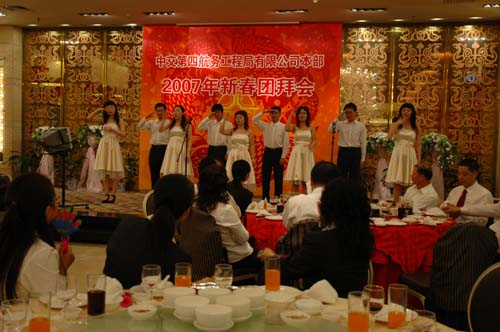 2月14日,公司本部在南園酒家舉行"2007年新春團拜會",大家滿懷喜悅,互致問候,共賀新年。梁卓仁董事長和孫國強總經理向員工拜年、祝酒,對大家在2006年的辛勤工作表示衷心的感謝,祝愿大家在新的一年里有更大的進步。團拜會由公司本部黨委書記張夏明主持。團拜會上表演了員工自導自演的文藝節目,抽獎活動更是把團拜會的氣氛推向了高潮,整個場面熱烈祥和,體現了四航大家庭的溫馨和諧,大家共祝四航的明天會更好。