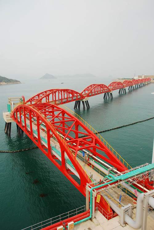 本工程為棧橋高樁墩臺開敞式碼頭,碼頭前沿離岸750米,泊位長490米,由1個工作平臺,2個靠船墩,6個系纜墩組成,工程是在原建15萬噸級碼頭的基礎上擴建為30萬噸的原油碼頭。