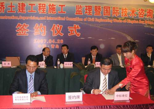 4月26日上午,青島海灣跨海大橋工程建設合同簽約儀式在青島市協和華天酒店舉行,梁卓仁董事長代表承建單位四航局與業主--山東高速集團青島高速公路有限公司正式簽約。