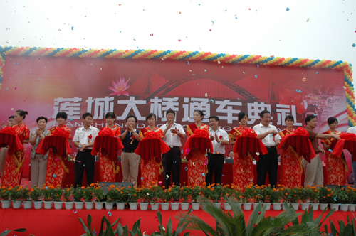 中交第四航務工程局有限公司投資4.2億元的BOT項目、世界首座斜拉鋼管拱橋--湘潭市蓮城大橋經過3年多的建設,于7月12日上午建成通車。中交股份副總裁侯金龍、四航局董事長梁卓仁出席通車典禮并致辭,與湘潭市主要領導、四航局總經理孫國強等一起為大橋通車剪彩。