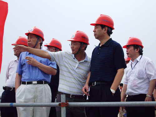 在施工現(xiàn)場(chǎng),考察團(tuán)聽(tīng)取了項(xiàng)目經(jīng)理關(guān)秋楓對(duì)工程特點(diǎn)和施工進(jìn)度情況的介紹。交通部水運(yùn)司原司長(zhǎng)、中國(guó)水運(yùn)建設(shè)行業(yè)協(xié)會(huì)名譽(yù)理事長(zhǎng)李悟洲連聲稱贊工程"干得不錯(cuò)"。