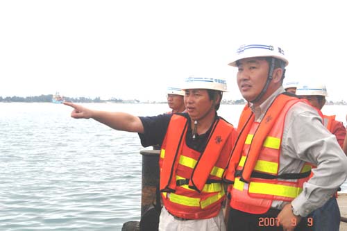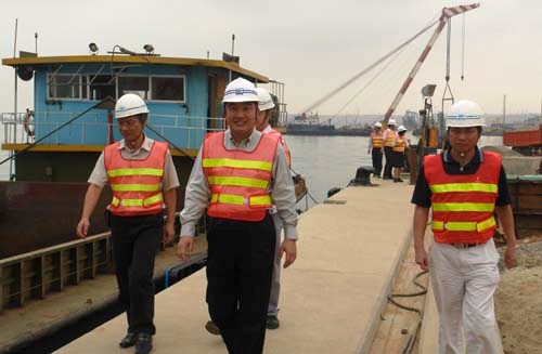 他察看了項目部預制場、主碼頭及離岸600米的油碼頭施工現場,驅車到采石場,登上多艘大型施工船舶全面了解工程進展、石料開采運輸情況和船容船貌、維修保養和船員生活情況。