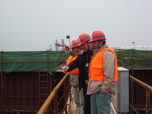春節(jié)期間,四航局董事長梁卓仁在三公司副總經(jīng)理秦慶生的陪同下,冒著陣陣寒風(fēng)來到了欽州中石油10萬噸級碼頭工地,親切慰問春節(jié)期間堅守在工地施工的所有員工。梁董事長還登上"防城港"號浮船塢及粵工拖"41"號等船組,拜訪業(yè)主并與業(yè)主領(lǐng)導(dǎo)進(jìn)行了親切地交談。