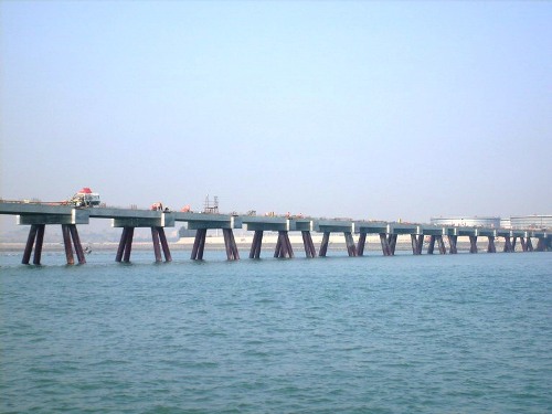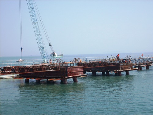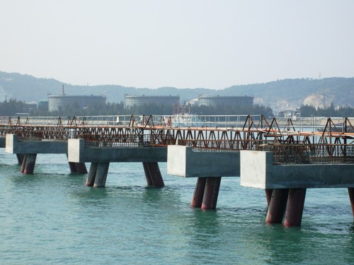 經過項目部員工努力奮戰,目前,引橋橋墩已全部澆注完成、引橋預應力空心T字梁板連接510米、可通車引橋橋面近400米,完成工程總量的65%,大大提高了碼頭主體的施工效率。