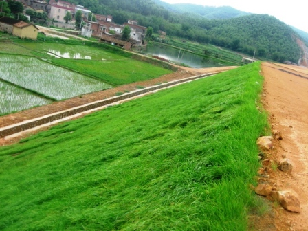 在施工工藝上,嚴格按照"綠化因地制宜"的生態原則,制定了因邊坡高度不同、邊坡土質不同、填挖方不同而不同的生態綠化方案。對基質為石質的路塹邊坡和基質為破碎風化石的邊坡,分別采用"土工格室、客土噴播植草防護"與"三維網與噴播植草防護"兩種不同的施工工藝,既穩固了邊坡,也使邊坡完全被植被覆蓋。