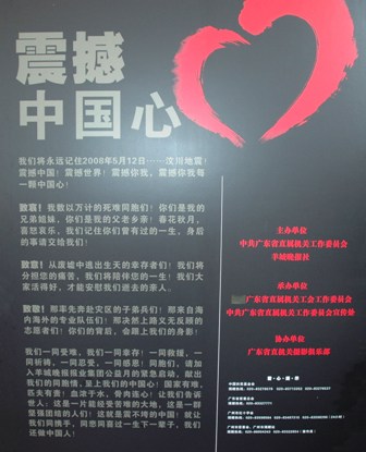 本次圖片展包括地震災情、黨和國家領導人親臨災區指揮抗震救災、人民子弟兵及廣大醫護人員在一線搶險救災等生動感人的照片100幅,真實直觀地再現了汶川大地震帶來的巨大災難。望著一張張淚流滿面的臉,看著救援人員被碎石瓦礫劃傷的雙手,白發蒼蒼的老人無助的神情……震撼著每個人的心靈,大家深深感受到中國人民敢于拼搏的昂揚斗志和不屈不撓的精神風貌及一方有難,八方支援,川粵同心、患難與共的摯熱情懷,生動詮釋了中國共產黨以人為本、執政為民的光輝形象。