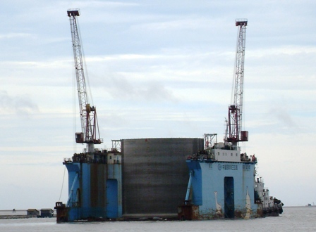 該工程共需安裝圓筒36個,每個高18.1米、外徑18米、壁厚34厘米、重1600噸。該工程自去年10月15日開工至今,各項工作進展順利。截止6月15日,已完成預制圓筒15個,水下開挖140萬方,拋石1.3萬方,基床打夯370米,基床整平250米。