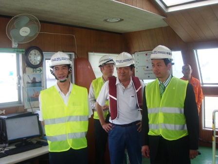 12日中午,莫總經理登上"小鷹號"抓斗挖泥船指導工作并與船員們進行傾心交流,從鋼絲纜使用、保養、工藝處理等方面指導技術人員,要求確保小鷹號安全生產。莫總此行還考察了泥駁的改造情況,并對泥門改造情況表示滿意。