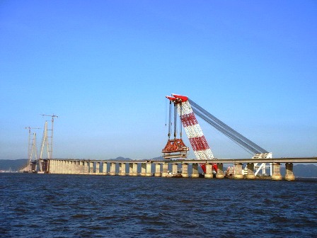 舟山金塘大橋全長26.54km,其中跨海段長18.27km。四航局承建該項目的第IV-F合同段,包括運輸和安裝重量1575噸、長度60米的箱梁470片,現澆濕接頭砼約28000立方,防撞墻施工56400米以及箱梁的體系轉換等,項目施工長度14.1km。