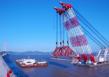 目前,金塘大橋項目部全力組織船舶調遷工作,"四航奮進"號船組預計本月19日起航前往青島,投入青島海灣大橋工程建設中。