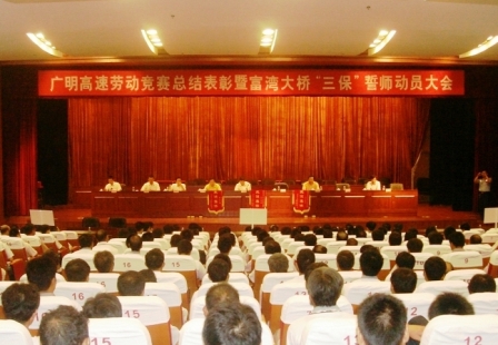 為了表彰先進、鼓舞士氣,充分調動廣大建設者的積極性,確保廣明高速公路明年4月建成通車,7月30日,廣明公司隆重舉行"廣明高速公路勞動競賽總結表彰暨富灣大橋‘保安全、保質量、保工期’三保誓師大會",對上階段"四比四賽"勞動競賽活動中涌現的先進集體和個人進行表彰,為富灣大橋項目部青年突擊隊授旗。廣明高速公路各參建單位共300多人參加。