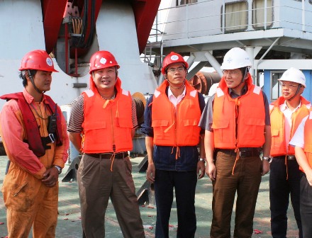 當天,董事長梁卓仁在二公司總經理李惠明等領導陪同下來到施工現場向項目部表示祝賀。梁董事長參觀了剛剛安裝完畢的箱梁,仔細詢問了安裝過程。他指出,要嚴格按照計劃工期開展施工,確保工程質量,克服現有不利因素的影響建好海灣大橋,打出四航局在北方市場的知名度;同時也要處理好與業主、監理、兄弟單位及地方行政單位的關系,做好服務工作,在各施工單位競賽中互相學習,和諧相處,爭當一流。