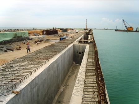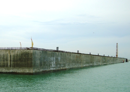 自今年7月19日開始澆筑第一段胸墻以來,該項目部就緊張有序地做好每段胸墻砼澆筑,努力克服八所地區惡劣季風氣候對施工作業的影響,克服原材料漲價和供應緊張的影響,見縫插針,積極創造條件。通過項目部的努力拼搏,用不到45天的時間安全高效地完成了17段碼頭胸墻砼共7500立方米的澆筑。