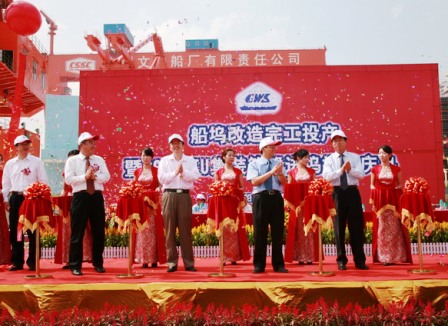 10月9日,四航局承建的廣州文沖船廠1號、2號船塢技術改造工程1號船塢完工投產,廣州文沖船廠有限責任公司在施工現場舉行了隆重的船塢完工投產暨2800TEU集裝箱進塢搭載慶典儀式。中國船舶工業集團公司總經理助理余寶山、廣州文沖船廠有限責任公司董事長殷學明;中交股份有限公司副總裁陳玉勝、四航局董事長梁卓仁、二公司總經理李惠明等領導出席了慶典儀式。