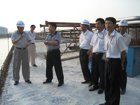 近日,湛江港董事長(zhǎng)鄭日強(qiáng)一行到湛江港寶滿集裝箱碼頭一期工程和湛江港股份有限公司新建油碼頭工程施工現(xiàn)場(chǎng)檢查指導(dǎo)工作,并聽取了施工進(jìn)度、安全質(zhì)量以及防御臺(tái)風(fēng)"海高斯"的情況匯報(bào)。