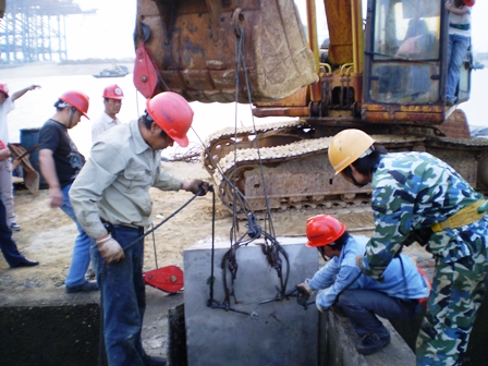 插板位于沉箱間的接縫處,單件長19.2米、寬1米,重8.5噸。鑒于該分項造價小、成本控制難的特點,嵩嶼項目部放棄了傳統配合安裝的工藝,將每件插板平分成6小段預制,同時自制兩個"鋼筋銷子"穿過鋼絲繩及插板吊環,輕松解決了下水解扣的難題;在穿過插板的拉桿兩端分別用焊接的十字槽鋼做螺栓帽,保證了插板在安裝時能沿倒濾井壁緩緩滑落,有效地節約了施工時間及成本。