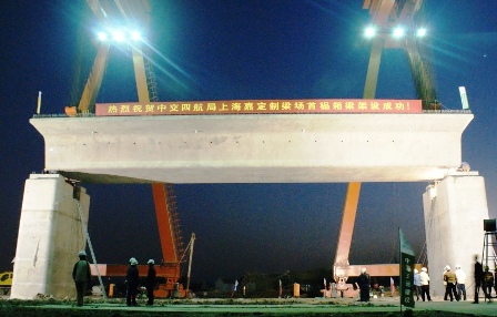 12月10日,四航局京滬高鐵項目部成功架設第一片箱梁。首片架設箱梁全長32.6米、高3.078米,重約840噸。