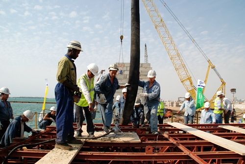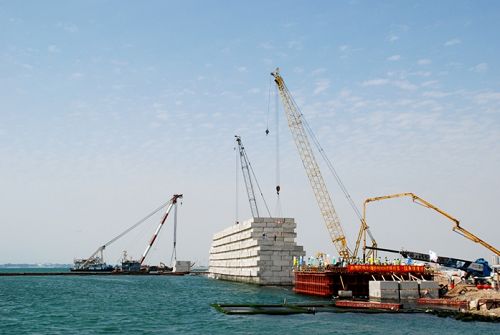 沙特RSGT碼頭工程共需澆筑胸墻71段,砼總量超過4萬立方米。由于胸墻底標(biāo)高低于潮位線,施工受潮水影響很大,為確保水下混凝土澆筑質(zhì)量,胸墻澆筑前,項目部制定質(zhì)量保證措施,進行了現(xiàn)場試驗并經(jīng)咨工認(rèn)可。胸墻澆筑時,各職能部門安排人員輪流值班,經(jīng)過7個小時的連續(xù)施工,第一段胸墻澆筑勝利完成。