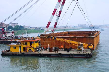 244號主墩第一節鋼圍堰呈長方形,長38.3米,寬20.3米,高6.8米,總重185噸,本次入水共耗時4小時。
