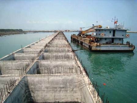目前,基床整平及第二批沉箱的預(yù)制施工正在進(jìn)行,沉箱內(nèi)回填砂及碼頭后方棱體拋填等施工正在有條不紊地進(jìn)行。