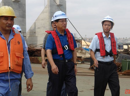 5月25日,中交股份副總裁陳玉勝一行在中港駐安哥拉辦事處副經理錢啟瑩的陪同下,到四航局羅安達項目部視察。