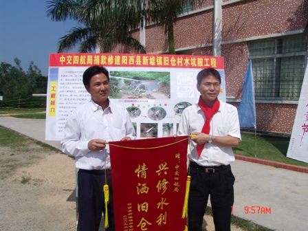 同時,由四航局出資5.6萬元,于5月26日順利完工的舊倉村水坑陂工程竣工儀式同時在活動現場舉行。該工程具有"排、引、灌"等水利三大功能,可解決舊倉村1300多畝農田的灌溉問題,為推廣現代化農業夯實了基礎,為確保農民增收創造了有利條件。舊倉村黨支部書記馬英深代表舊倉村4628名村民向四航局總經理孫國強贈送了錦旗,感謝四航局解決了村民種田"灌溉難"的問題。