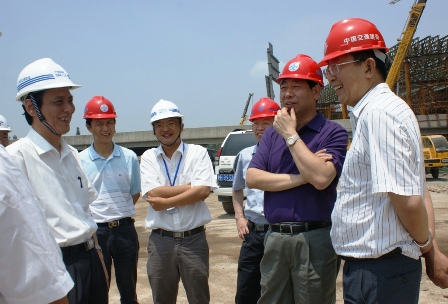 6月17日,中交股份總裁孟鳳朝一行在京滬高鐵六標段項目部常務副總經理王建和四航局副總經理羅寬榮的陪同下,蒞臨京滬高鐵項目部視察。