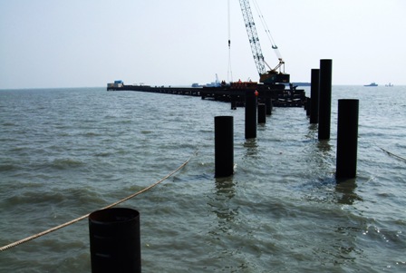 同時(shí),檳城二橋主橋項(xiàng)目大陸側(cè)棧橋碼頭施工進(jìn)展順利。大陸側(cè)棧橋總長(zhǎng)度783米,碼頭長(zhǎng)88米,寬21米,共計(jì)5782平方米,主要由基礎(chǔ)鋼管樁振打、型鋼架設(shè)、橋面鋪裝三部分組成。截至7月12日,大陸側(cè)棧橋碼頭255條鋼管樁施工全部完成,并完成橋面鋪設(shè)3388平方米。目前,項(xiàng)目部正向大橋主體工程發(fā)起沖鋒。