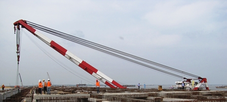 寶滿集裝箱碼頭構件共1454件,其中前后軌道梁共140件,后軌道梁單根重達70噸,跨距39米,安裝準確率及安全性要求高,安裝難度大。為此,項目部積極找尋合作單位及船機資源,嚴格控制成本,對聯合起吊工藝、杠桿起吊工藝、船機改造等方案進行反復論證與測試,最終確定由"粵惠州工9628"實施安裝。