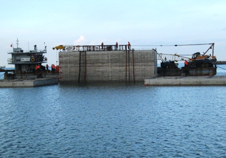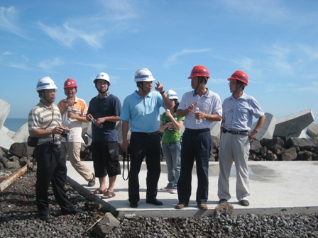 黃副局長認真聽取了項目部施工負責人的匯報后,在項目部領導的陪同下,到碼頭施工現場參觀了沉箱出運安裝、碼頭后方棱體拋理及倒濾層、護岸擋浪墻工、扭王塊出運及安裝等工序的施工。他指出,項目部沉箱安裝進度及質量水平相當到位,同時對其他正進行的各分項施工質量、進度及安全也表示滿意,希望項目部再接再厲發揚優良傳統,保質、保量、安全地完成下階段施工。