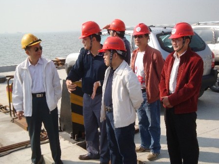 鄧立文局長一行察看了已完工的舾裝碼頭和船臺、水下滑道項目,對新會分公司目前的建設情況表示滿意。鄧立文指出,四航局新會基地項目建設現已接近尾聲,要高度注重施工的安全、質量,為項目建設畫上完美的句號。