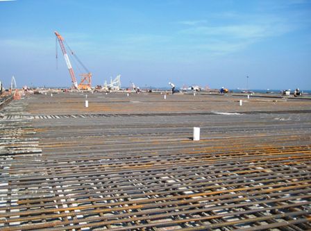 該工程為高樁梁板結構,碼頭長度678米,碼頭沉樁基668根,預制安裝構件1454件,現澆混凝土2.9萬方,護岸拋石44萬方,后方回填砂振沖密實78萬方。橫梁部分采用C50高性能混凝土,共80條,單根混凝土方量118方。目前,現澆施工進展順利,樁帽、橫梁已澆注完成,現澆面層及磨耗層施工將全面展開,項目部正搶趕進度,爭取在12月底全面完成混凝土的澆筑任務,完成年度施工計劃。