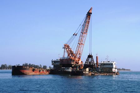 該工程內(nèi)容包含滾裝碼頭基槽及港池挖泥,挖泥斷面層總方量約為97萬(wàn)方,其中約46萬(wàn)方的炸礁量,合同工期13個(gè)月。鑒于KBR嚴(yán)格的管理模式,項(xiàng)目部精心籌備前期工作,合理利用有限資源,及時(shí)組織人員設(shè)備進(jìn)場(chǎng),提前采購(gòu)炸藥,確保了項(xiàng)目順利開工。