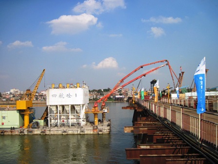 為確保主墩大直徑3.0米水中超長樁的順利完成,四航貴廣指揮部精心策劃,科學組織,從人員機械調配到典型施工、澆筑現場的有效指揮以及突發事件的應急措施等方面均作了充分準備。施工中,大橋西主墩受征地阻擾,陸地施工便道無法拉通,直接影響樁基礎砼的灌筑。在協調解決征地問題期限不明朗的情況下,四航局權衡工期、成本等因素,充分配置資源,加大投入,采用水上拌和船("四航砼1")灌筑西主墩樁基礎砼。該船是目前四航局最先進的混凝土拌合船,也是國內目前同類施工生產能力較強的船舶,混凝土生產能力達到每小時200立方米,該船舶的投入,為工程的順利推進,確保洪水來臨前主塔出水發揮了重大作用。