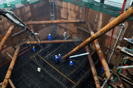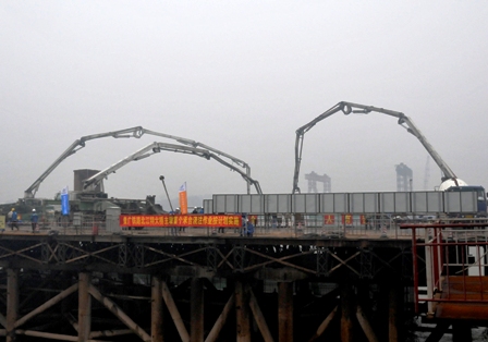 244號主墩承臺長35米,寬17米,高6米,砼方量達3570立方米,單體一次性澆筑方量居四航局之首。面對困難,貴廣三項目部精心組織,多次召開施工動員會和承臺施工技術交底會,認真安排、詳細部署,并組織承臺專項質量安全生產大檢查,確保施工萬無一失。4月18日10時15分,該部兩座攪拌站、四條生產線同時開動全速生產,25臺攪拌車、5個卸料點不間斷下料,高峰下料速度達到每小時160立方米以上。經過一百多名技術人員的持續努力,最終比預計時間縮短8小時順利完成澆筑。