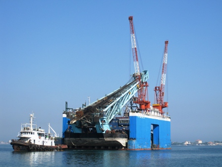 "粵工樁9"船是一艘86米樁架的打樁船,船長64.6米,船寬26.4米,排水量3319噸,是一艘入級船舶。2008年5月經(jīng)過中國船級社檢驗(yàn)出廠,2009年4月調(diào)遣到安哥拉施工。為保證該船證書的有效性,必須進(jìn)行塢修。三公司安哥拉船舶部組織有關(guān)技術(shù)人員、船長等對"粵工樁9"船進(jìn)塢修理進(jìn)行專題研究,針對該船長度超出"四航東南"號浮船塢等難點(diǎn),以及船舶自重、添加設(shè)備及材料、壓載水和生活用水等進(jìn)行計(jì)算,采取嚴(yán)密的安全措施,使該船順利地進(jìn)塢修理,為四航局海外自行塢修大型工程船舶積累了難能可貴的經(jīng)驗(yàn)。