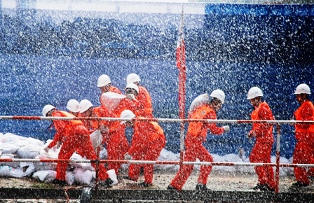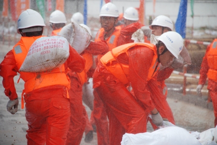 本次演習是中交股份廣泛深入開展"安全生產月"的一項重要活動,演習結合華南地區(qū)臺風多發(fā)的實際,針對目前社會關注的坍塌問題,共模擬防臺、圍堰防洪、塔吊加固、基坑坍塌、天然氣爆炸失火及人員疏散等六個場景。