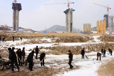該項目5號主墩前期受征拆及設計變更影響,施工進度較滯后,制約著溫河大橋整體施工進度。此次除雪鏟冰及時消除了惡劣天氣對施工生產造成的不利影響,也彰顯了項目部員工爭分奪秒搶進度的良好精神面貌。