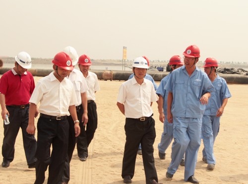在干散貨碼頭項目施工現場,孫國強一行聽取了施工進展情況的匯報,并對項目建設情況表示滿意。他要求項目部繼續發揚團結奮進、頑強拼搏的良好作風,加強全面管控力度,科學規劃組織,加快施工進度,同時做好高溫天氣下的防暑降溫工作。