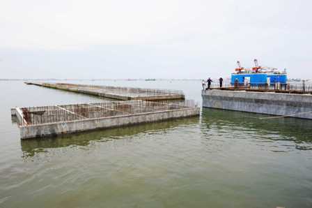 洛比托擴建項目礦石碼頭共預制沉箱19件,單件長18.7米、寬14.3米、高17.3米,約重2200噸,是迄今為止安哥拉境內規模最大的沉箱。綜合考慮成本、工期、人力資源等因素,項目部沒有引進專業分包隊伍施工,自行組織由技術員、施工班長帶頭、當地勞工為主力軍的施工班組施工,把整個施工工藝流程逐個分解量化,并認真落實,確保了整個施工計劃如期完成。該項目19件沉箱安裝面平線順,相鄰沉箱高差不超過5厘米,縫隙不超過5厘米,得到了南華監理、中港和外國咨工的一致贊賞。