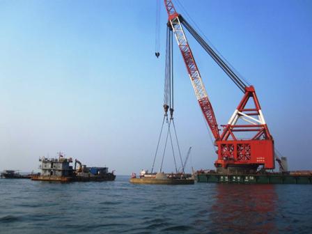 該工程共需預制安裝18件蓋板,單件重量約460噸,采用1500噸起重船吊運安裝。該工程位于欽州灣口海域三墩作業區南側約8.5公里的海域,由于施工區域距離陸地較遠,外海風浪大,給蓋板的吊運安裝帶來很大的困難。項目部克服了多種困難,成功把第一件蓋板安放在圓筒上,為后續的蓋板安裝施工積累了寶貴經驗。