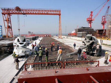此預應力板線投產是繼2條1500噸預應力梁生產線后的又一條超大預應力生產線投產。此預應力張拉臺座由樁基基礎、壓柱、橫向連續梁、底板、端部重力墩、牛腿、鋼梁結構及張拉系統構成。張拉臺座長158米,寬7.6米,本條生產線一次張拉可生產13~15件實心面板或空心板,最大張拉力可達1200噸,屬目前國內最大張拉力的預應力板線。