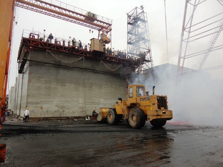 該工程沉箱分兩種型號,最大單位沉箱長18米、寬12米、高16.8米,重1568噸。沉箱預制自2011年5月28日開工,采用先澆底座、后滑模墻身的分層施工工藝。施工過程中,項目部成立QC小組,以“精益求精,鑄造精品”為理念,高標準高要求實施管理,精心編排施工方案,創造了三公司單月預制19件大型沉箱的新紀錄。