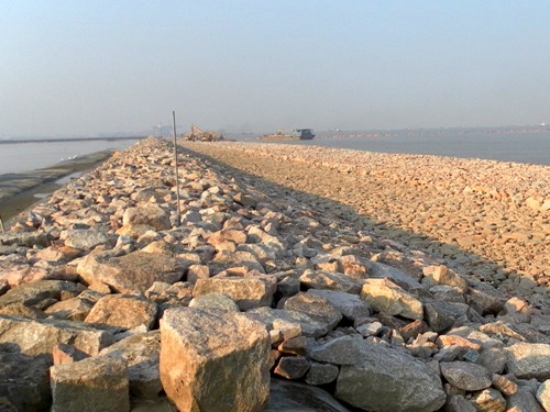 本工程采用充填砂袋結構施工,其中,北圍堰為210米的延長段,東圍堰為長1832米,分隔圍堰1088米,南圍堰1034.57米,西圍堰1832米,設計圍堰頂標高5.8m,頂寬2m。工程于2011年01月10日開工,2011年12月05日完工。