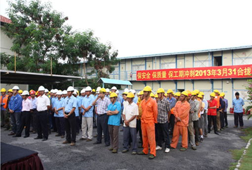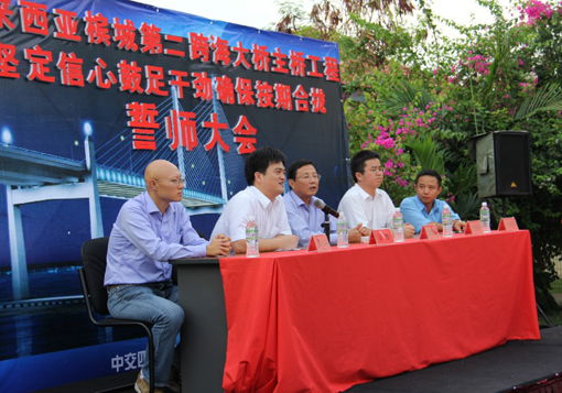 3月20日,馬來西亞檳城二橋項目部召開了“保安全、保質量、保工期沖刺2013年3月31日主橋合攏”誓師動員大會,再次掀起趕工熱潮。中港項目總部副總經理范強生、一公司副總經理吳浩等領導,各參建隊伍代表共計100多人參加了誓師動員大會。