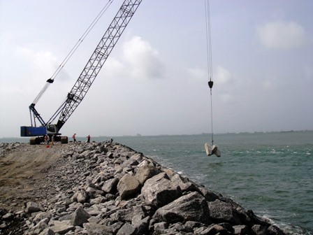 東堤需安裝7.2t扭王塊660件,5.8t扭王塊1785件。目前,尼日利亞項目部施工全面鋪開。在全體施工人員的共同努力下,項目在完成東堤堤頭陸推和形成初步的抗浪能力節點后,順利完成東堤堤頭圓弧段水下3t塊石護面拋填安裝,并使其具備扭王塊安裝條件。