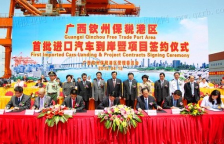 廣西壯族自治區(qū)副主席楊道喜,欽州市委書記、市人大常委會(huì)主任張曉欽,市長(zhǎng)肖鶯子,中國汽車工業(yè)進(jìn)出口總公司總裁張福生等領(lǐng)導(dǎo)出席簽約儀式,并為首批進(jìn)口汽車到岸剪彩。
