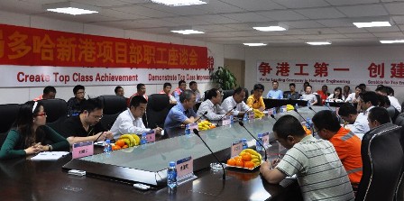 李惠明一行視察了施工現(xiàn)場,了解重要分項工程的建設(shè)情況及施工進度,并出席了多哈新港項目部員工座談會。會上,李惠明對項目部全體員工在艱苦環(huán)境中付出的努力給予了肯定,對員工的身心健康和年輕員工的發(fā)展表示關(guān)心和慰問。