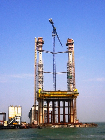 主橋工程是檳城第二跨海大橋全線關鍵控制性工程,而主塔的施工又是主橋工程建設的重點、難點。主塔為組合式H型直塔,由下塔柱、橫梁、上塔柱及塔尖組成,索塔高93.6米,下塔柱27.64米,橫梁高5米,上塔柱60.96米。塔柱采用液壓自爬模系統施工,橫梁采用落地大鋼管支架進行施工。